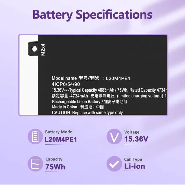 LONG-LASTING BATTERY LIFE: With 15.36V, capacity (75Wh/4883mAh), the (L20M4PE1) battery ensures all-day power for your laptops in a factory-fresh, never-used battery pack designed for maximum performance.