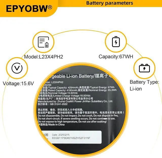 SpecificationsBattery Model: L23X4PH2 / Voltage: 15.6V / Capacity: 67Wh 4294mAh 4-cell / Color: Black / Condition: Brand New.