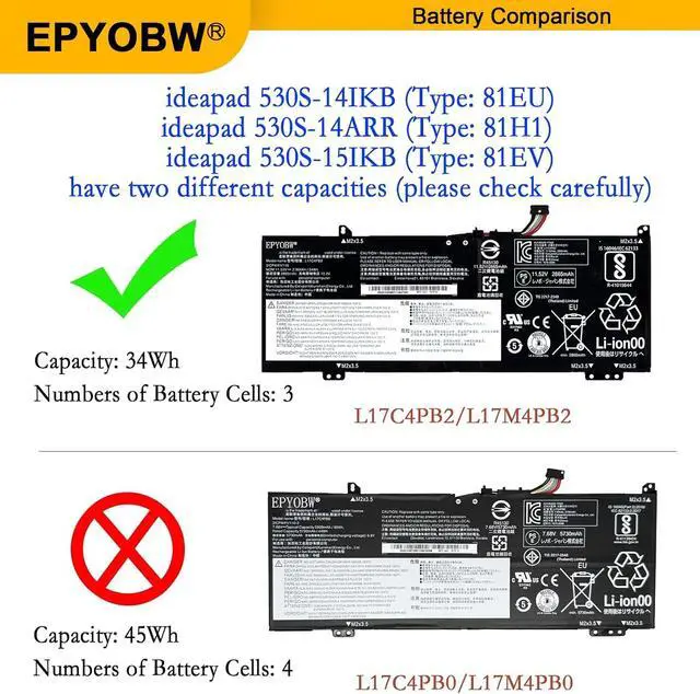 Compatible with Laptop Models For Lenovo ideapad 530S-14IKB (Type: 81EU) Series; For Lenovo ideapad 530S-14ARR (Type: 81H1) Series; For Lenovo ideapad 530S-15IKB (Type: 81EV) Series.(Note: There are two different capacities: L17C4PB0 L17M4PB0 45Wh and L17C4PB2 L17M4PB2 34Whsuitable for different laptops. You can open the back of the laptop to check the original battery model.)