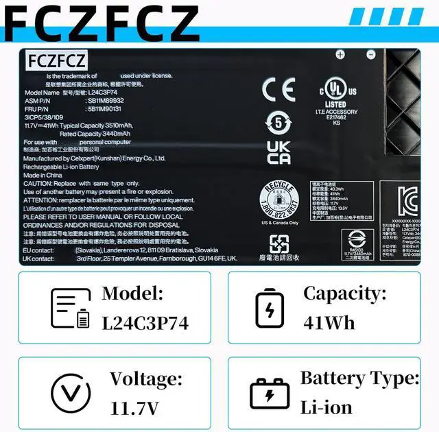 SpecificationsBattery Model:L24C3P74 // Voltage:11.7V // Capacity:41Wh 3510mAh 3-cell // Color:Black // Condition:Brand New.