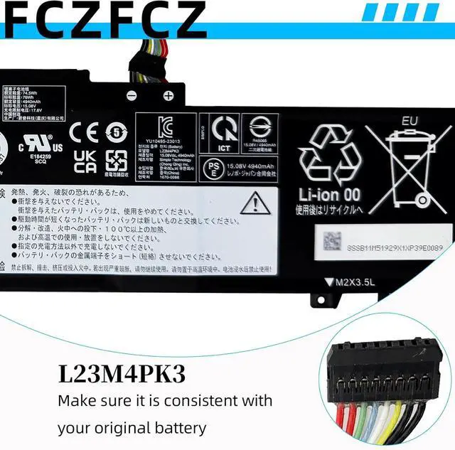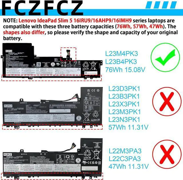 Replacement for Part NumberL23M4PK3 SB11M51929 5B11M51928 L23B4PK3 SB11M51931 5B11M51933 SB11M51932 5B11M51930 (NOTE: This battery is only compatible with the IdeaPad Slim and is not compatible with the IdeaPad Pro. These laptop models are compatible with batteries of different capacities (76Wh, 47Wh, 57Wh) and shapes. To save your time and money, please open the laptop back cover to confirm your battery is the same as described in the picture before ordering.)