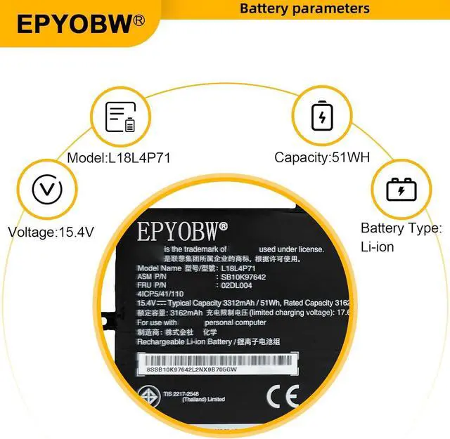 SpecificationsBattery Model: L18L4P71 / Voltage: 15.4V / Capacity: 51Wh 3321mAh 4-Cell / Color: Black / Condition: Brand New.