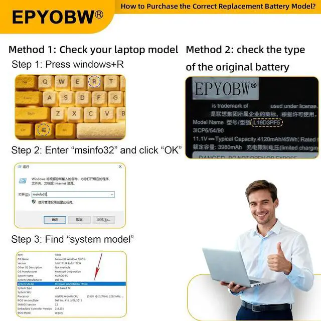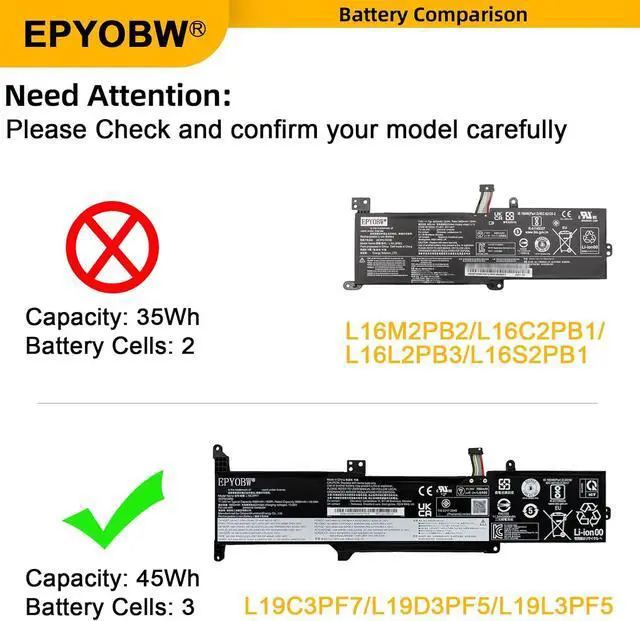 (Note: There are two different capacities here (L16M2PB2 L16C2PB1 L16L2PB3 L16S2PB1 35Wh and L19C3PF7 L19D3PF5 L19L3PF5 45Wh), and L16L2PB3 35Wh there are two different appearances, their hole positions are different, and the compatible laptop models are also different. You can open the back of the laptop to view the original battery model,please make sure that your original battery is the same as the picture shown before ordering.)