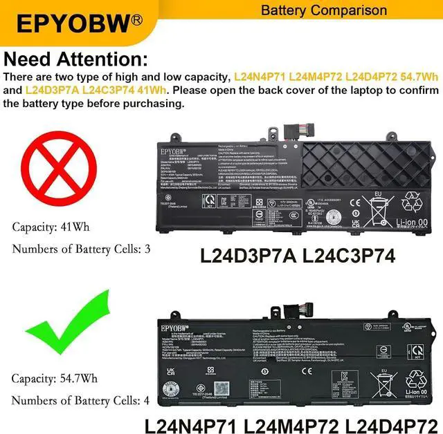 Compatible with Laptop Models For Lenovo ThinkPad L13 Gen 6 (Type: 21R5 21R6) Series; For Lenovo ThinkPad L13 Gen 6 (Type: 21RB 21RC) Series; For Lenovo ThinkPad L13 Gen 6 2-in-1 (Type: 21R7 21R8) Series; For Lenovo ThinkPad L13 Gen 6 2-in-1 (Type: 21RD 21RE) Series.(Note: There are two type of high and low capacity, L24N4P71 L24M4P72 L24D4P72 54.7Wh and L24D3P7A L24C3P74 41Wh. Please open the back cover of the laptop to confirm the battery type before purchasing.)