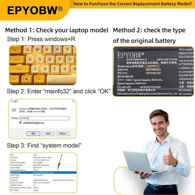 Purchase Skills Please open the back cover of the laptop before ordering and make sure that the original battery model is consistent with the listing. After getting the battery, please install the battery correctly, make sure that the battery connector is firmly connected to the laptop motherboard, and use the original charger to charge the laptop.Discharge the new battery to 5% (not 0%), then charge and cycle 3-4 times to wake up the new battery.