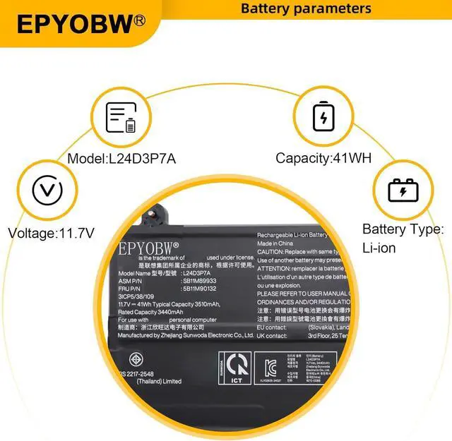Specifications Battery Model: L24D3P7A/ Voltage: 11.7V / Capacity: 41Wh 3510mAh 3-cell / Color: Black / Condition: Brand New.