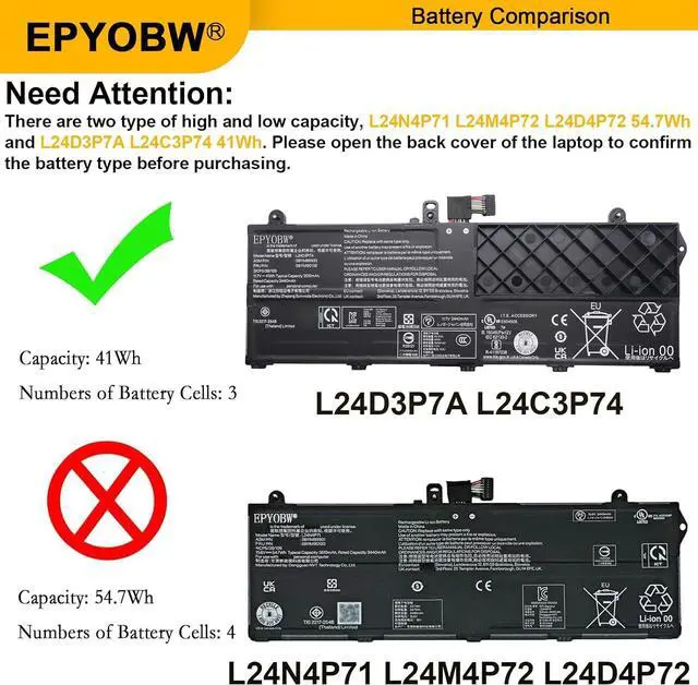 Compatible with Laptop Models For Lenovo ThinkPad L13 Gen 6 (Type: 21R5 21R6) Series; For Lenovo ThinkPad L13 Gen 6 (Type: 21RB 21RC) Series; For Lenovo ThinkPad L13 Gen 6 2-in-1 (Type: 21R7 21R8) Series; For Lenovo ThinkPad L13 Gen 6 2-in-1 (Type: 21RD 21RE) Series.(Note: There are two type of high and low capacity, L24N4P71 L24M4P72 L24D4P72 54.7Wh and L24D3P7A L24C3P74 41Wh. Please open the back cover of the laptop to confirm the battery type before purchasing.)