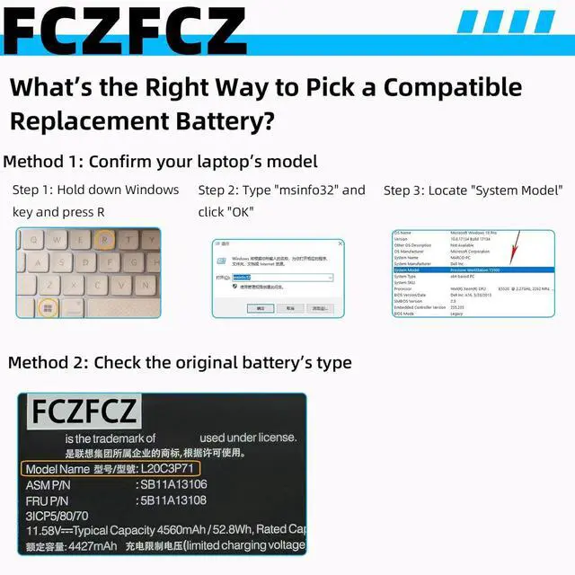 InstructionsPlease open the back cover of the laptop before purchasing and confirm that the original battery type is the same as the picture. Please read the battery instruction manual carefully before installing the battery. Please install the battery correctly and ensure that the battery interface and the motherboard are firmly connected. Please use the original charger to charge the laptop. After battery installation, discharge the new battery to 5% (not 0%), then charge and cycle 3-4 times to wake up the new battery.