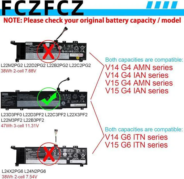 Compatible with Machine Modelsfor Lenovo V15 G4 AMN (Type: 82YU 83CQ) Series; for Lenovo V15 G4 IAN (Type: 82YW) Series; for Lenovo V15 G5 IRL (Type: 83GW 83HF) Series. NOTE: V14 G4 AMN / V14 G4 IAN / V15 G4 AMN / V15 G4 IAN series of laptops are compatible with two capacity batteries (47Wh and 38Wh), and they differ in length. To avoid purchasing the wrong battery, please open your laptop's back cover to check the original battery and its capacity.
