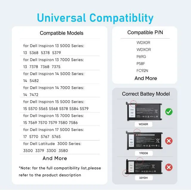 Compatible P/N: WDX0R, WDXOR, P69G, CYMGM, FC92N, P58F, 3CRH3, P69G001, FW8KR, T2JX4, P58F001, 8YPRW, C4HCW, and more. Not compatible with YRDD6 or 33YDH