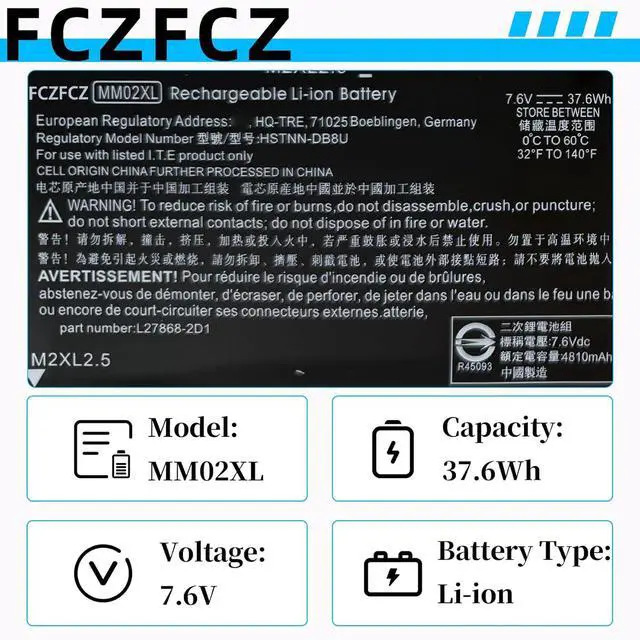 Replacement for Part NumberMM02XL MM02037XL L28076-005 L27868-2D1 L27868-1C1 HSTNN-DB8U HSTNN-1B8Q HSTNN-IB8Q