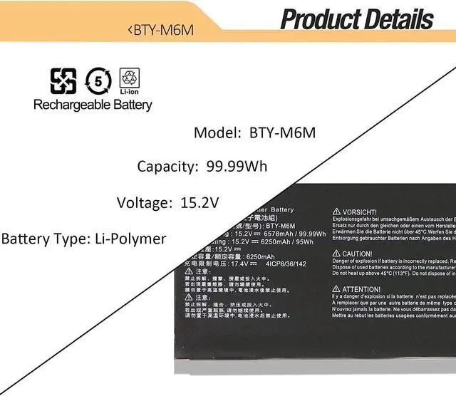 BTY-M6M 15.2V 95Wh/6250mAh Compatible for MSI GS66 Stealth 10SF 10SFS 10SGS GE66 Raider 10SD 10SE GE76 Raider 10UE 10UG 10UH 11UE 11UG 11UH WS66 10TK 10TL WE76 11UK 11UM