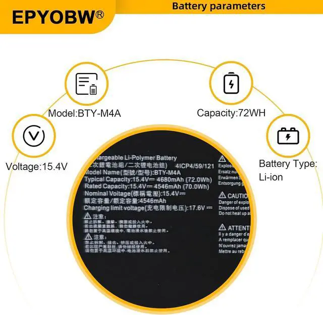 Specifications Battery Model: BTY-M4A / Voltage: 15.4V / Capacity: 72Wh 4680mAh 2-Cell / Color: Black / Condition: Brand New.