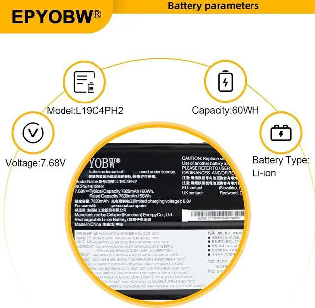 SpecificationsBattery Model: L19C4PH2 / Voltage: 7.68V / Capacity: 60Wh 7820mAh 4-Cell / Color: Black / Condition: Brand New.