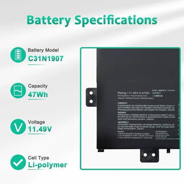 LONG-LASTING BATTERY LIFE:With 11.49V,capacity (47Wh/4165mAh/3-cell),the(C31N1907) battery ensures all-day power for your laptops in a factory-fresh, never-used battery pack designed for maximum performance.