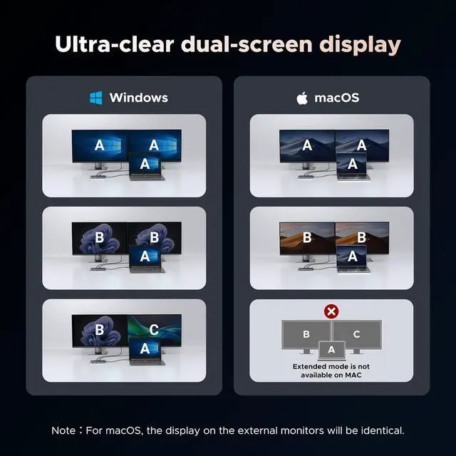 Dual 4k HDMI Docking Station: The Docking Station will hook up two displays to both HDMI ports in 4K@60Hz max. Please note that due to MacOS limitations, all extended monitors will display the same content when connecting MacBooks