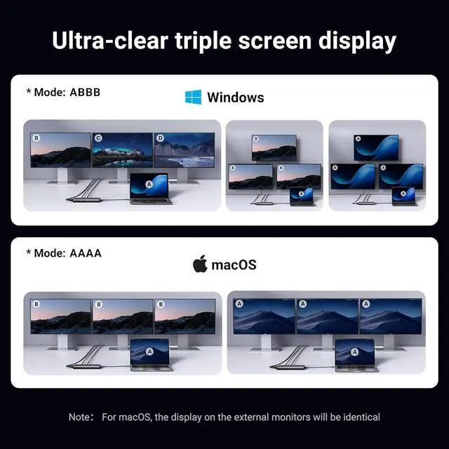 When 2 or 3 monitors connected to Mac, the docking station can only support extending one monitor, and the other monitor can only copy the monitor you extended, which means it only supports AAAA or ABBB. Do NOT support differential display (ABCD)