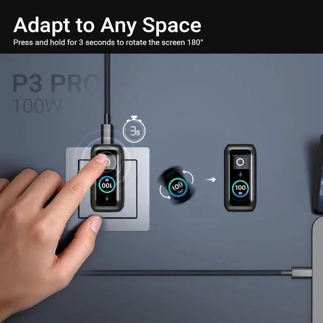 Smart Display for Real-Time Insights MINIX P3 PRO smart display rotates to 180°with a simple 3 Seconds press and provides real-time details on charging status, temperature, and port performance, ensuring safe and efficient charging at all times.