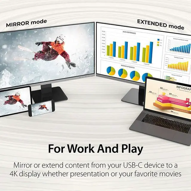 Universal Compatibility: Designed for USB-C ports supporting video output (DP Alt Mode) or Thunderbolt 3 & 4, ensuring broad compatibility with devices like the iPhone 15 Series, MacBook Pro, MacBook Air, iPad Pro, Surface, XPS, Chromebook, Galaxy S23/S22/S21/S20, Steam Deck, and many others. The available USB-C port supports DisplayPortAlt Mode and USB Power Delivery 2.0 or 3.0 for enhanced connectivity and power options.