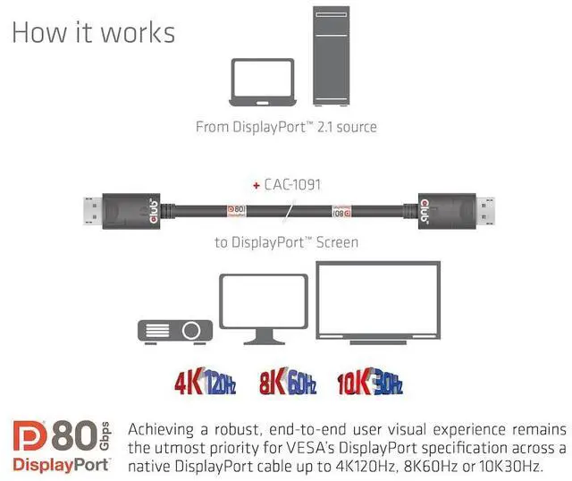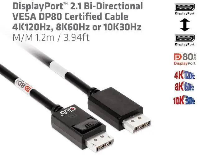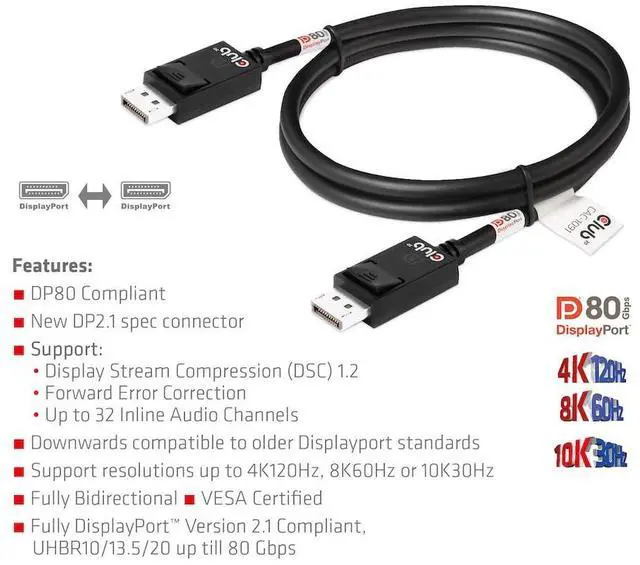 Backwards compatible with older DisplayPort standards; supports resolutions up to 4K120Hz, 8K60Hz or 10K30Hz