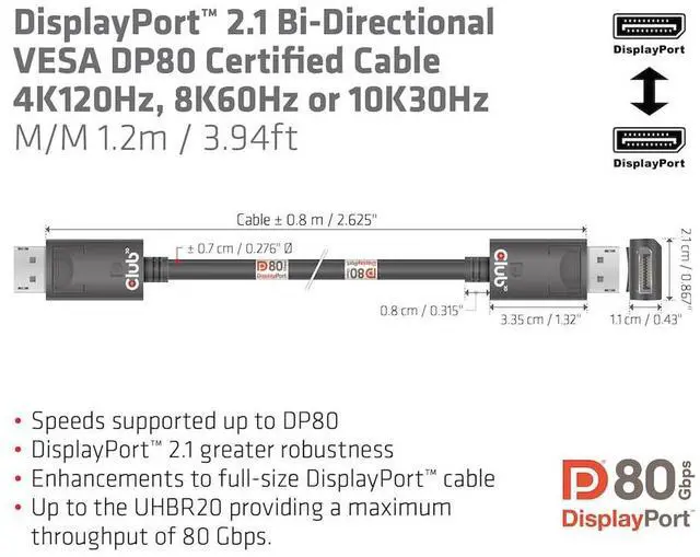 Fully DisplayPort version 2.1 compliant, UHBR10/13.5/20 up to 80Gbps; DP80 compliant