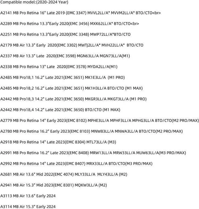Applicable model:It is compatible with MacBook Pro/Air Model A2141 A2251 A2289 A2179 A2337 A2338 A2442 A2485 A2681 A2779 A2780 A2991 A2992 A2918 A2941 A3113 A3114 2020-2024 Year