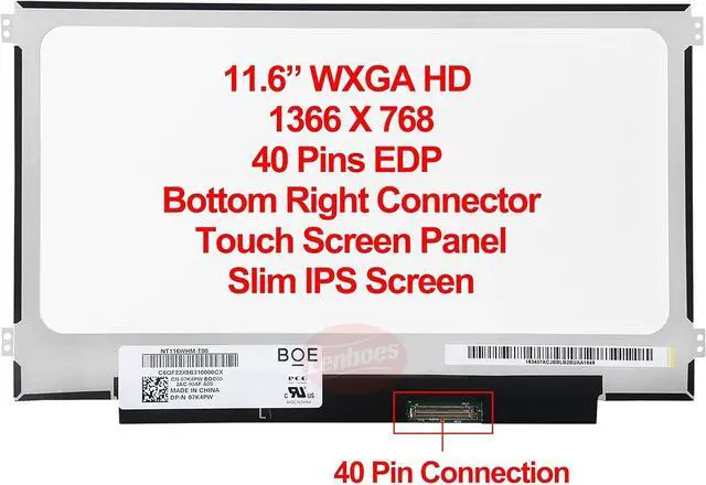 Screen Size:11.6 inch; Resolution:1366x768 HD ; Touch Screen Version; Connector: 40 Pins Bottom Right; Finish: Glossy or Matte, Depend on Our Real Stock