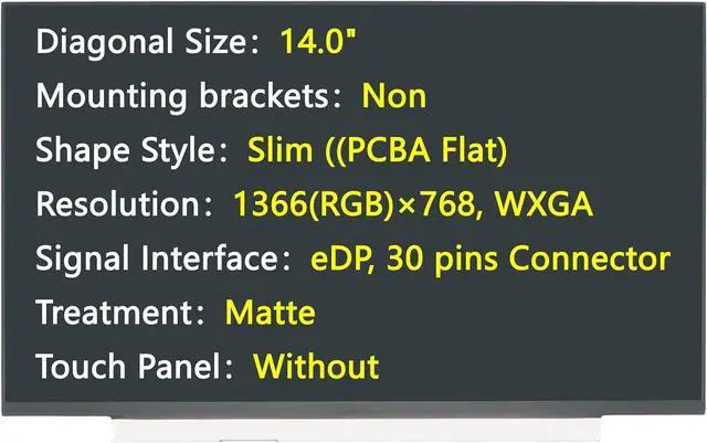 • Diagonal Size14.0 inch Fixed positionNot Shape StyleSlim (PCBA Flat, T3.2mm); Resolution1366(RGB)×768, WXGA Signal TypeeDP/30 pins Connector TreatmentMatte Touch PanelWithout