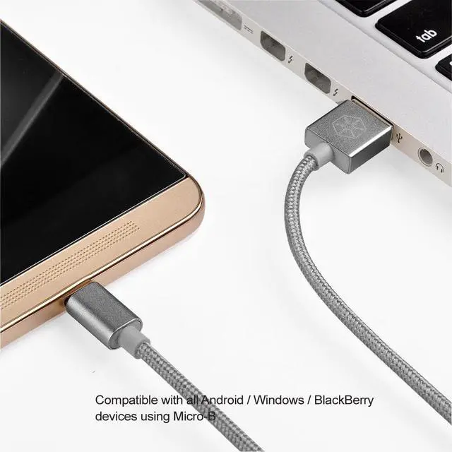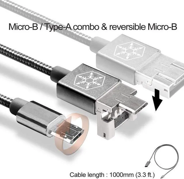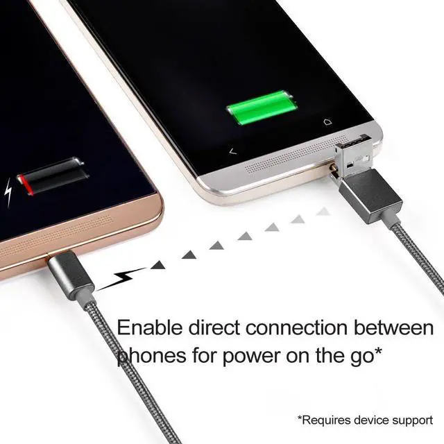 Unique 2 in 1 Micro-B and USB type-A Combo connector Reversible Micro-B connector Supports OTG function Supports emergency charging between Android devices Cable sleeved with Nylon braiding