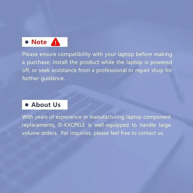 About UsWith years of experience in manufacturing laptop component replacements, D-KXCPELE is well-equipped to handle large volume orders. For inquiries, please feel free to contact us.