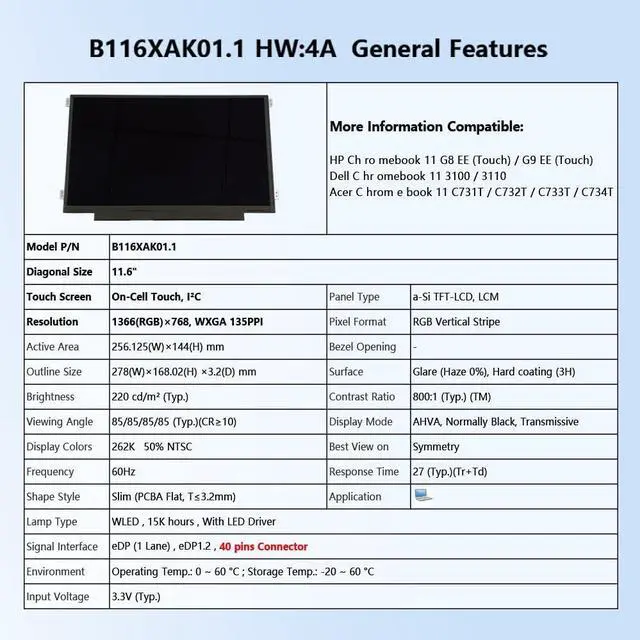 Replacement for HP Chromebook 11 G6 EE (Touch) /11 G7 EE (Touch)/ 11 G8 EE (Touch) /Dell Chromebook 11 3100 LCD Touch Panel