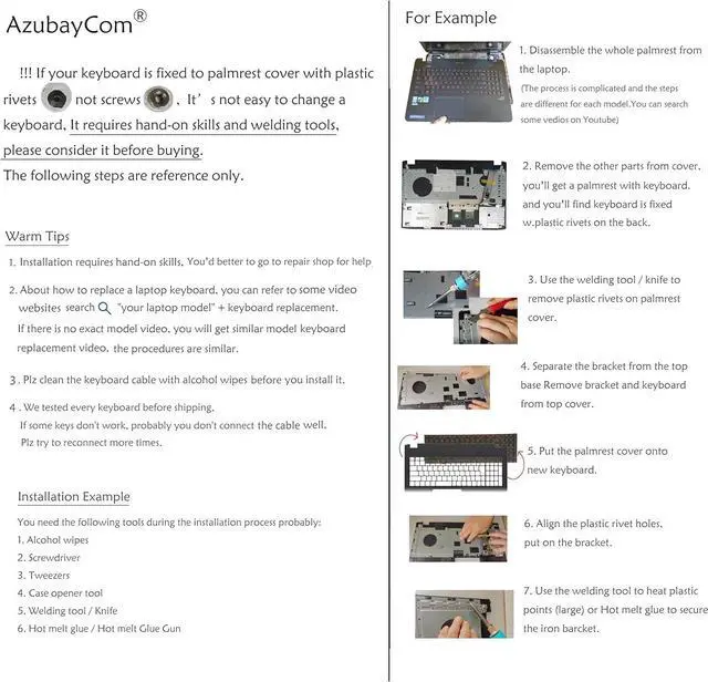 4) Please clean the keyboard cable and connector base on the motherboard before you install it. 5) Please use an anti-static tool when your are dealing with the internal laptop parts. 6) After installing the keyboard, you may need to update the driver or restart your laptop for your keyboard to work.