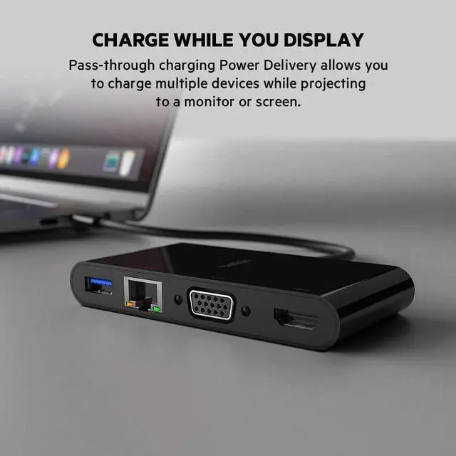 Keep watching and stay charged with a multimedia adapter that enables up to 100W of pass-through power. The five-port USB hub supports Gigabit Ethernet, USB-A 3.0, VGA, 4K HDMI, and data transfer through USB-C, making it the perfect tool in meetings, auditoriums, classrooms, or on the go. This simple plug-and-play technology is compatible with Mac and Windows laptops and USB-C devices.