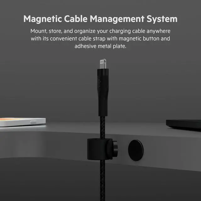 MAGNETIC CABLE MANAGEMENT: Our cable comes with a cable strap with a magnetic clip and a metal plate for easy mounting anywhere, making cable management a breeze