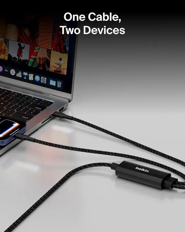 SMART POWER SHARING: The cable automatically optimizes charging efficiency by intelligently distributing power between connected devices, ensuring each gets the fastest, most reliable charge possible, whether you're powering one device or two.