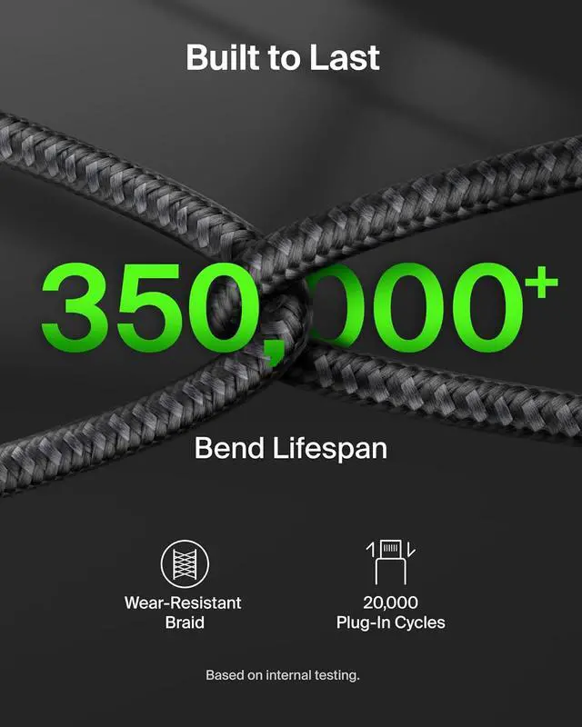 DURABLY MADE WITH DOUBLE BRAIDED EXTERIOR: Charging cable is crafted to endure years of regular use. A 94.5% post-consumer recycled polyester exterior** helps it withstand over 350,000 bends, ensuring reliable performance.***