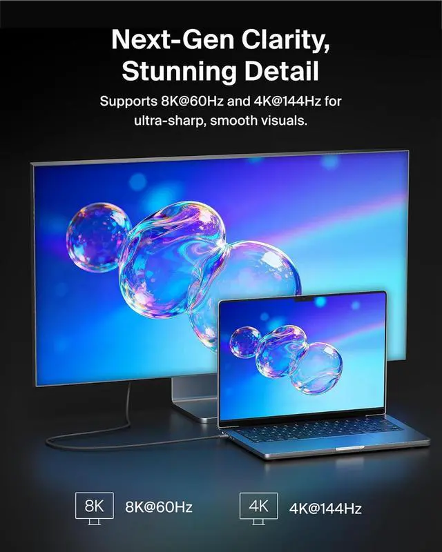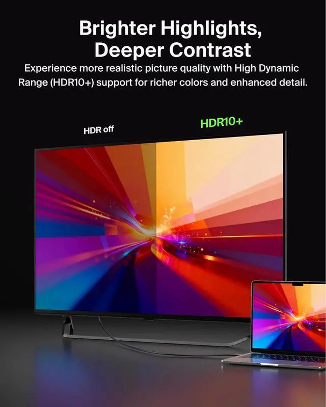 Connect USB-C devices and laptops to an HDMI display with our USB-C to HDMI Cable to get vividly sharp HDR and up to 8K resolution at 60Hz and 4K at 144Hz
