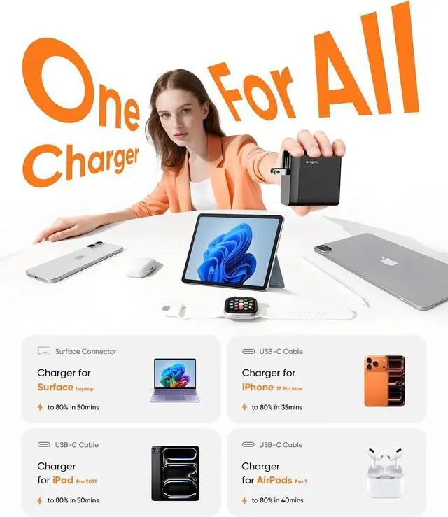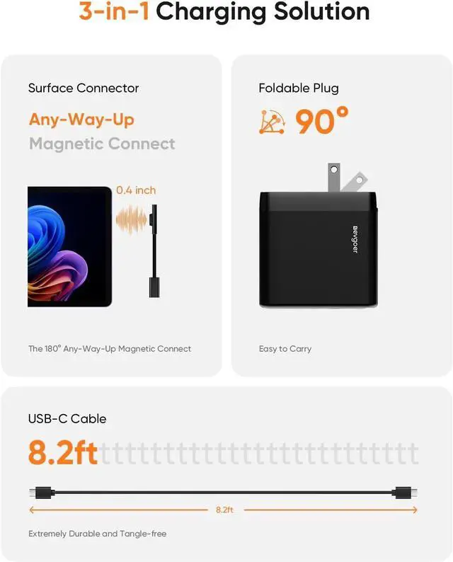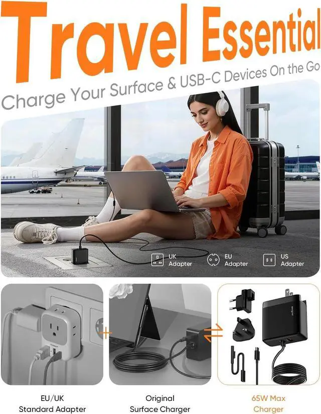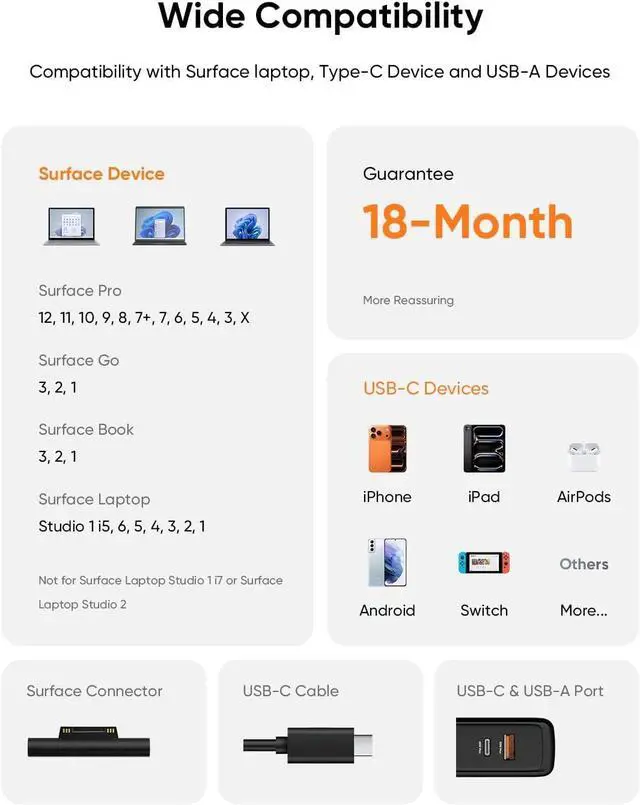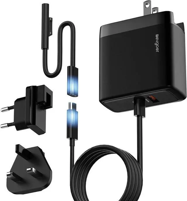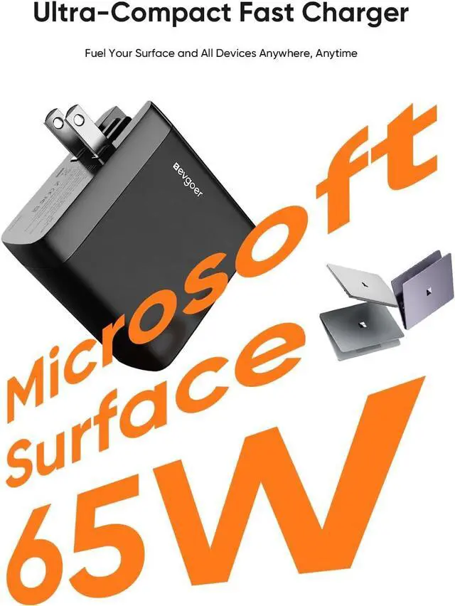 Works with All Your Devices Power up nearly every Surfaceincluding Pro 3-12/X, Laptop, Book, and Go seriesand fast-charge any USB-C phone, tablet, or accessory. One charger, fewer cords, no hassle.