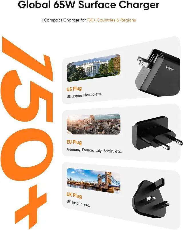 All-in-One Charger for Surface & USB-C Replace your original Surface charger, USB-C adapter, and travel plugs with one compact kit. Get everything you need in the box: the 65W charger, a USB-C cable, magnetic Surface connector, and both EU & UK plug adapters.