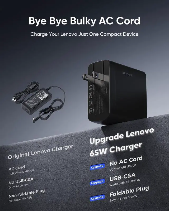 34% More Compact & Foldable Design: Engineered to be exceptionally portable, this mini Lenovo laptop charger is 34% shorter than standard Lenovo 65W adapters. It combines high-speed charging, a foldable plug, and wide compatibilityall in a pocket-friendly form thats perfect for travel.