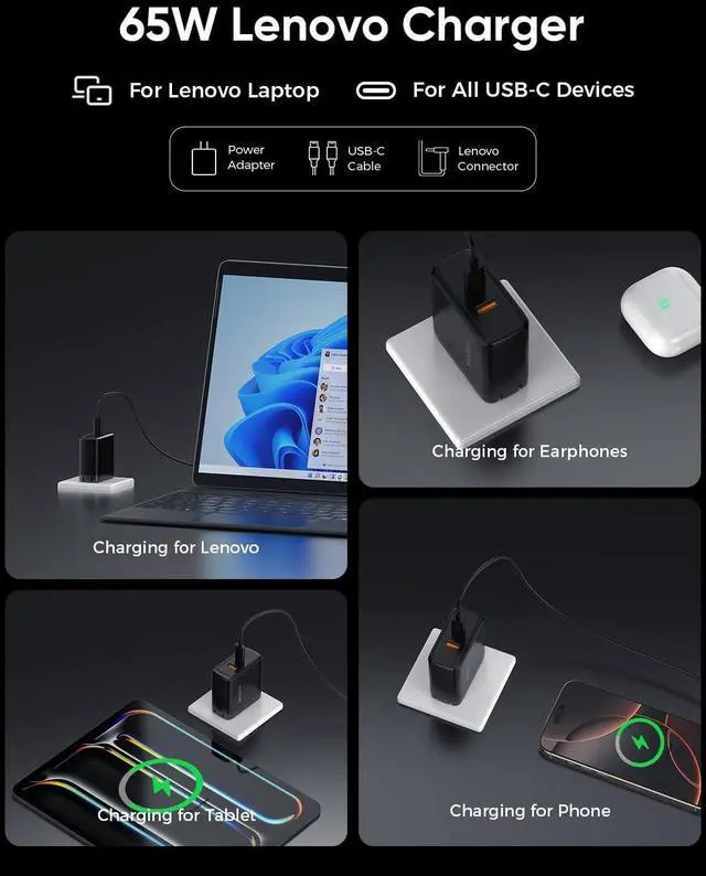 The Ultimate 2-in-1 Power Solution: This Lenovo charger consolidates your power needs into one sleek device. It's engineered to deliver full-speed 65W to your Lenovo laptop, while offering universal compatibility for all your USB-C devices. One charger, dual missionsimplifying your work and life anywhere.