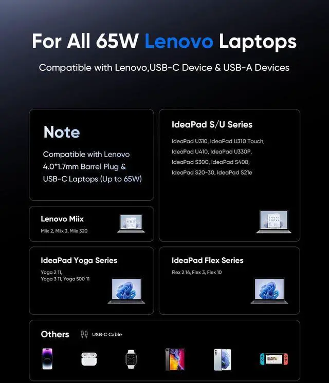 Broad Lenovo Laptop CompatibilityThis 65W charger is specifically designed for Lenovo laptops, compatible with a wide range of models including: the Lenovo Mix series (Mix 2 / Mix 3 / Mix 320); IdeaPad S/U series (U310 / U310 Touch / U410 / U330P / S300 / S400 / S20-30 / S21e); Yoga series (Yoga 2 Tl / Yoga 3 Tl / Yoga 500 Tl); and Flex series (Flex 2 14 / Flex 3 / Flex 10).