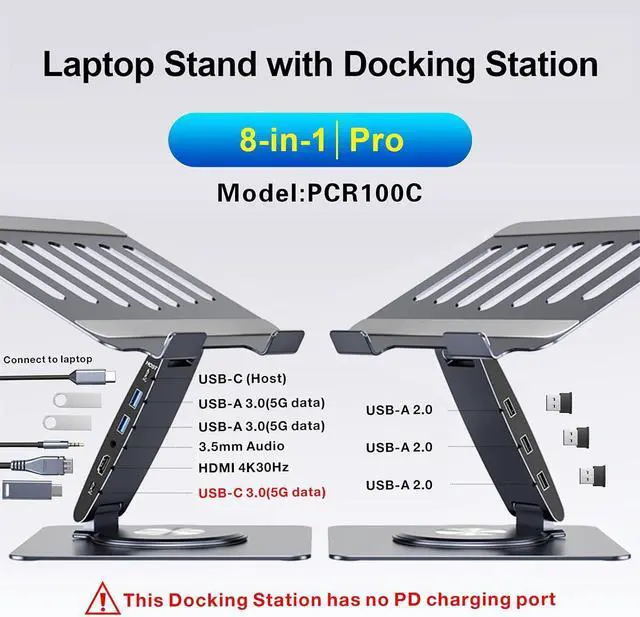 360-degrees SwivelThis aluminum laptop stand docking station, which doubles as a universal docking station, offers a 360-degrees swivel feature. It allows you to easily share your laptop screen with friends or colleagues, making it an ideal laptop dock and laptop stand solution for collaborative work environments