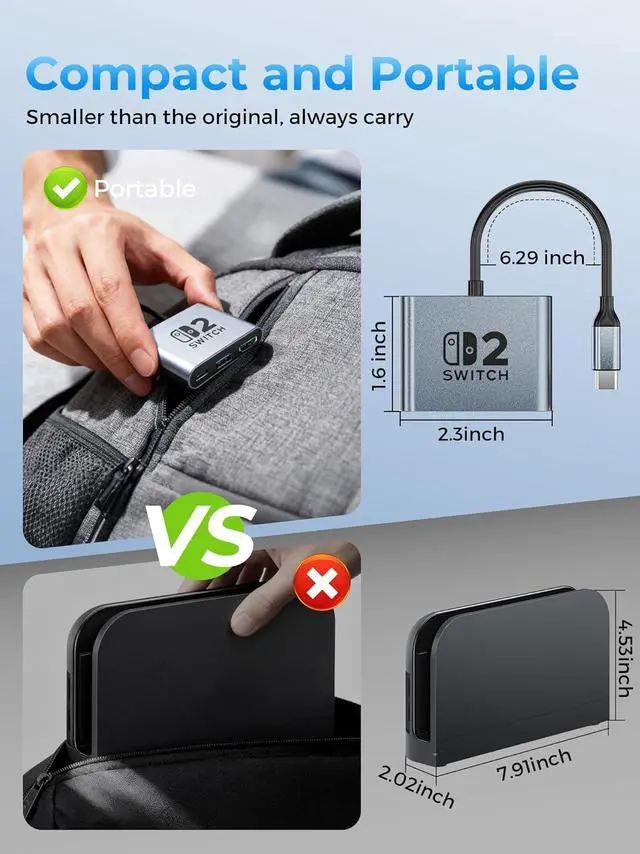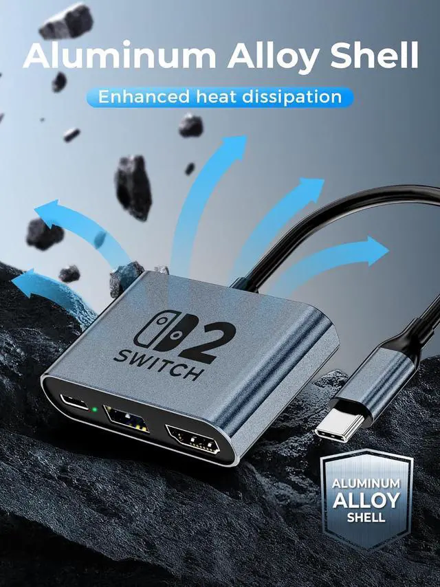 Lightweight and PortablePortable switch 2 TV dock constructed from durable aluminum alloy that enhances durability and heat dissipation, it eliminates the need for bulky plastic switch 2 dock and overheating concerns. Its compact size fits easily into backpacks, making it perfect for travel and on-the-go scenarios, ready to handle any game anytime.