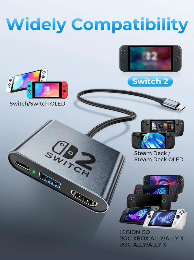 Wide CompatibilityUSB C docking station compatible with a wide range of devices including Switch 2/Switch/ Switch OLED / Steam Deck / Steam Deck OLED /MSI Claw/Rog ally/Rog Xbox Ally /Legion Go 1/2/ S. Effortlessly mirror screens from various devices to your monitor, meeting the needs of both gamers and professionals.
