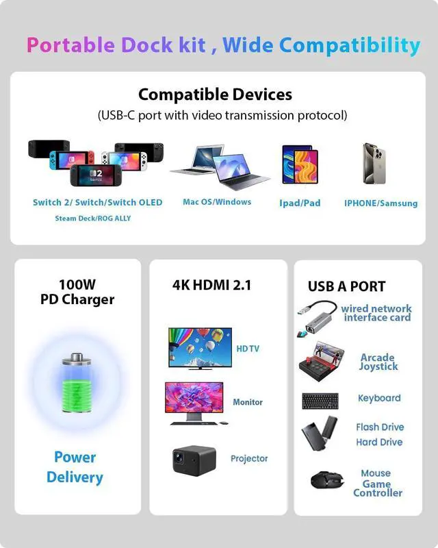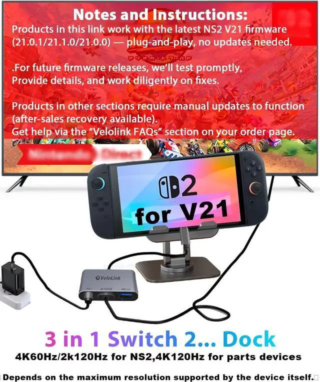 Swich 2 dock for Nintendo Switch 2 Docking Station featuring an HDMI 2.1 port and compatible with the latest official firmware version 21.0.0. no manual updates requiredsimply use it on your newest console. Designed as a portable travel dock, it replaces bulky official docks. Whether at work or on the go, carry it anywhere and enjoy gaming anytime.