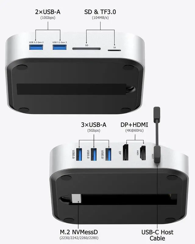 [All-in-One 10-Port Connectivity] This USB-C docking station expands your Mac Mini with 2× USB-A 10Gbps and 3× USB-A 5Gbps ports. It also features HDMI, DisplayPort (DP), USB-C (5V 3A Max), and SD/TF card slots, transforming your setup into a fully productive workstation.
