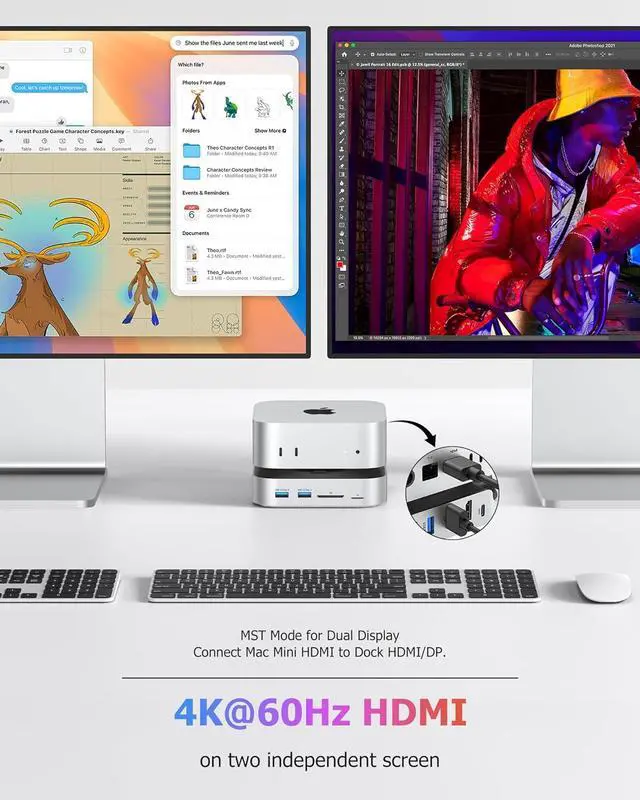 [MST Mode and Mirror Mode for Dual Displays] Easily set up dual displays with Extended Mode by connecting the Mac Mini HDMI port to the first display and using the docks HDMI/DP port for the second display, creating a larger workspace with 4K at 60Hz on both screens. Alternatively, enable Mirror Mode by connecting both displays to the docks HDMI and DP ports, displaying identical content on each screen at 4K at 60Hz.