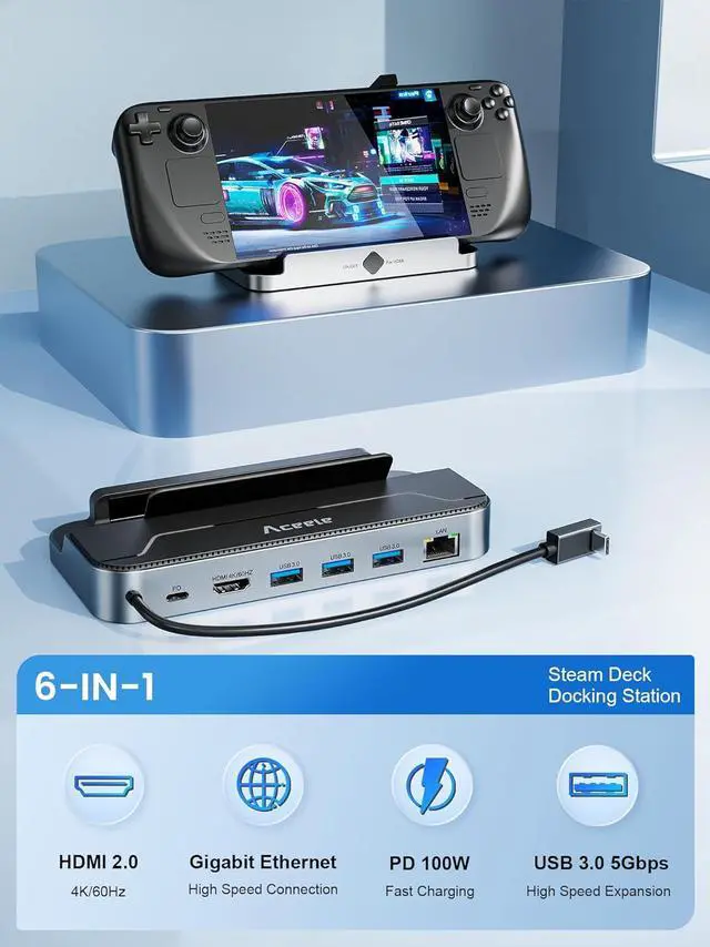 6 IN 1 Docking Station for Steam DeckThis USB C Dock Docking is for Steam Deck, comes with an HDMI 4K@60Hz output, a Gigabit Ethernet input, 3 USB 3.0 5Gbps high speed data ports and a 100W PD USB-C full speed charging port. 6 IN 1 steam deck docking station combines the hub and stand together perfectly, keep desktop neat and organized.