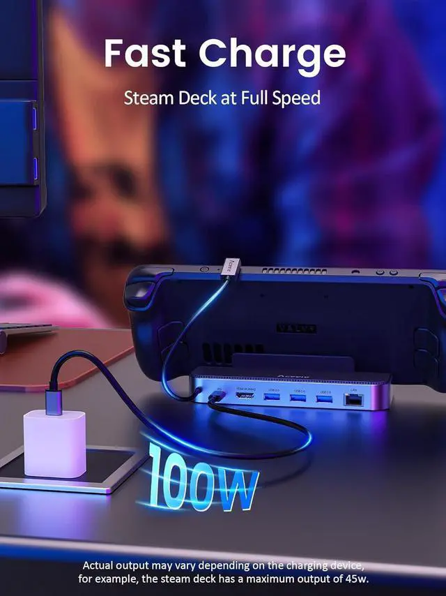 Steam Deck for Full Speed ChargingSteam Docking Station supports 100W Max power delivery, which is enough to charge your Steam Deck.It is recommended to use the original AC adapter or an adapter with 45W or more. (Note: The MAX charging speed of Steam Dock is 45W).